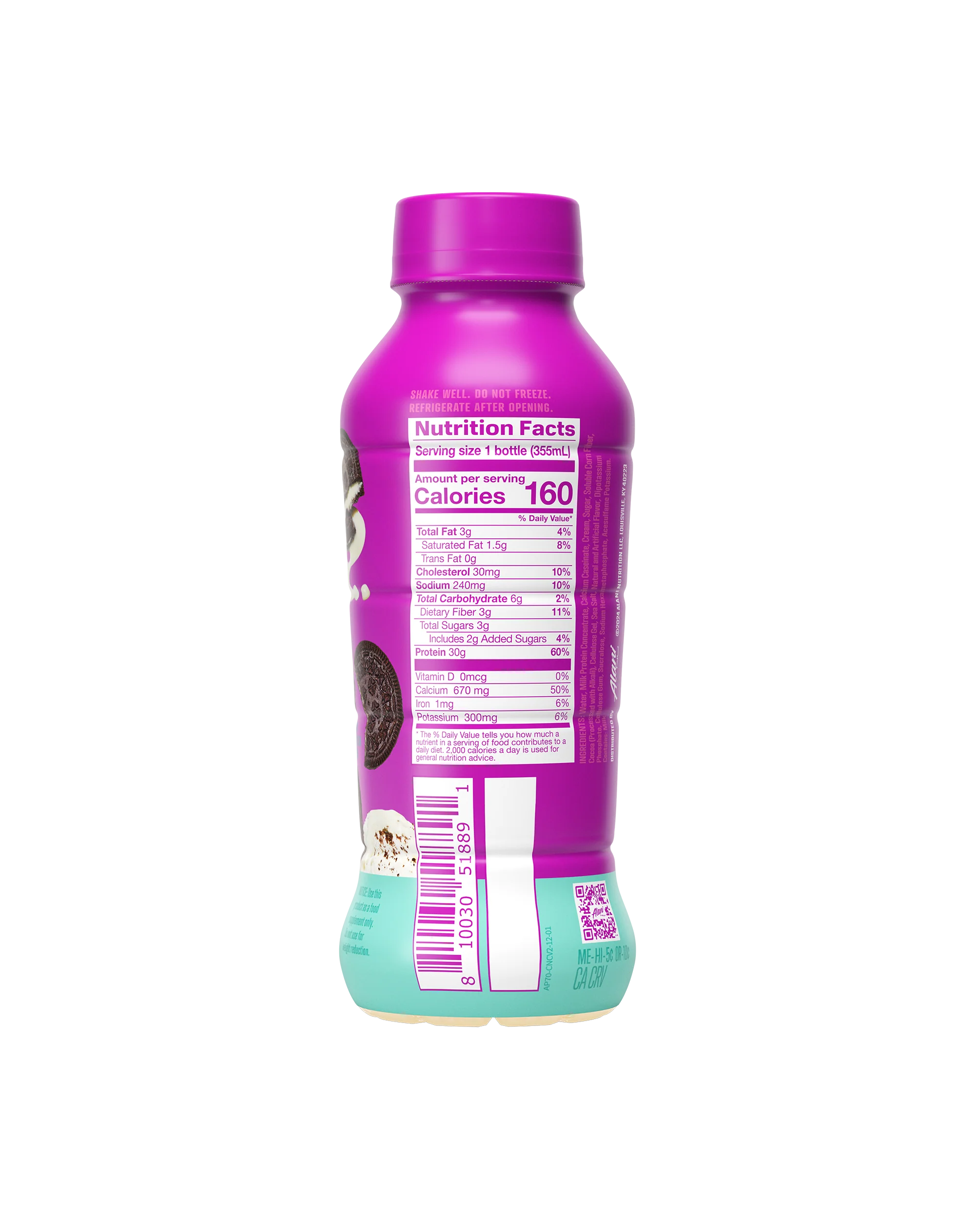 Shake on the day with our new ready-to-drink protein shake formula, now with 10g more protein! At 30g protein and only 160 calories, these silky-smooth shakes are here to help you hit those macros and get your gains (without the chalky aftertaste!). Bursting with the nostalgic flavor of your fav classic cookie combo, toss it in your bag for the perfect post-workout treat or on-the-go snack.Â