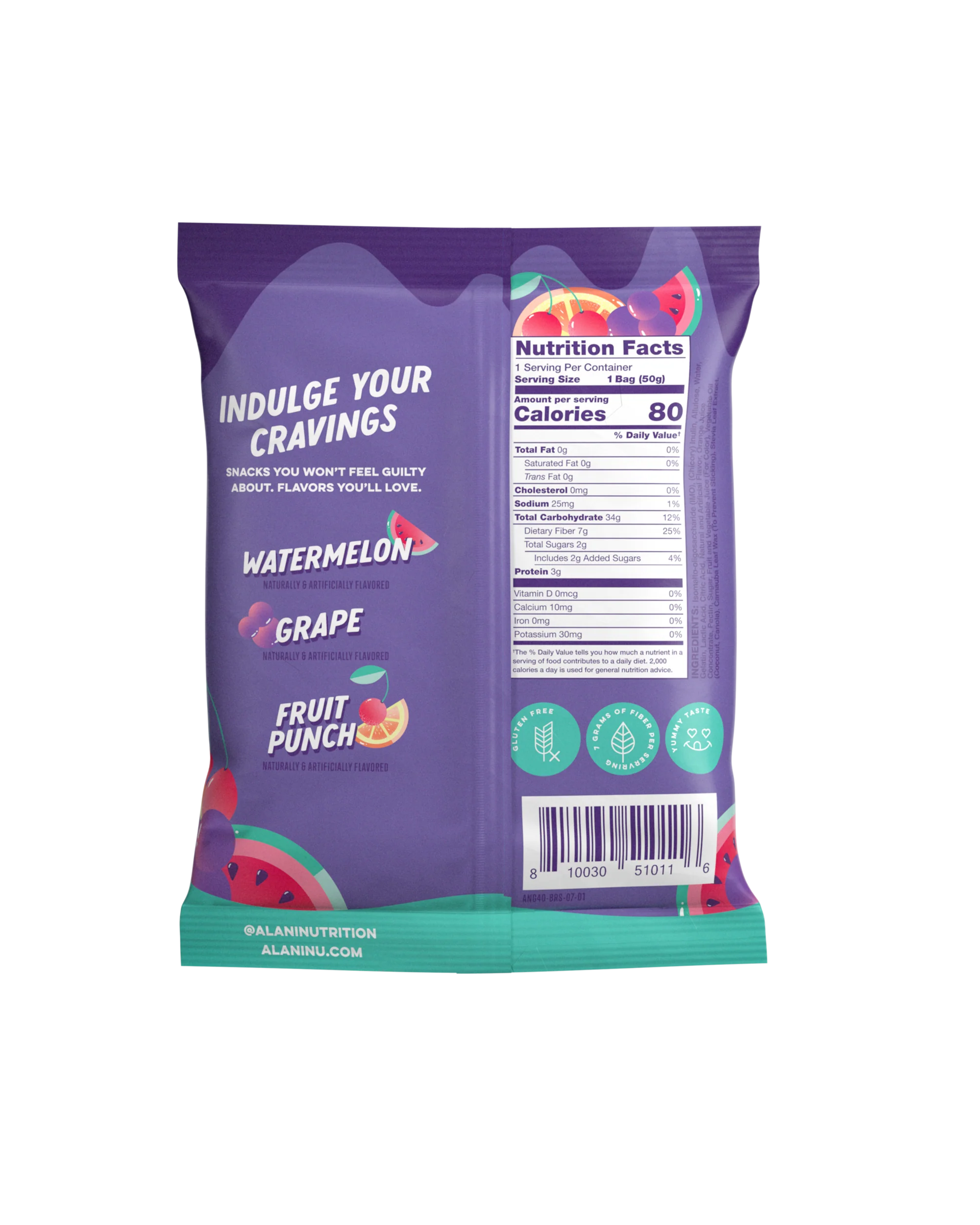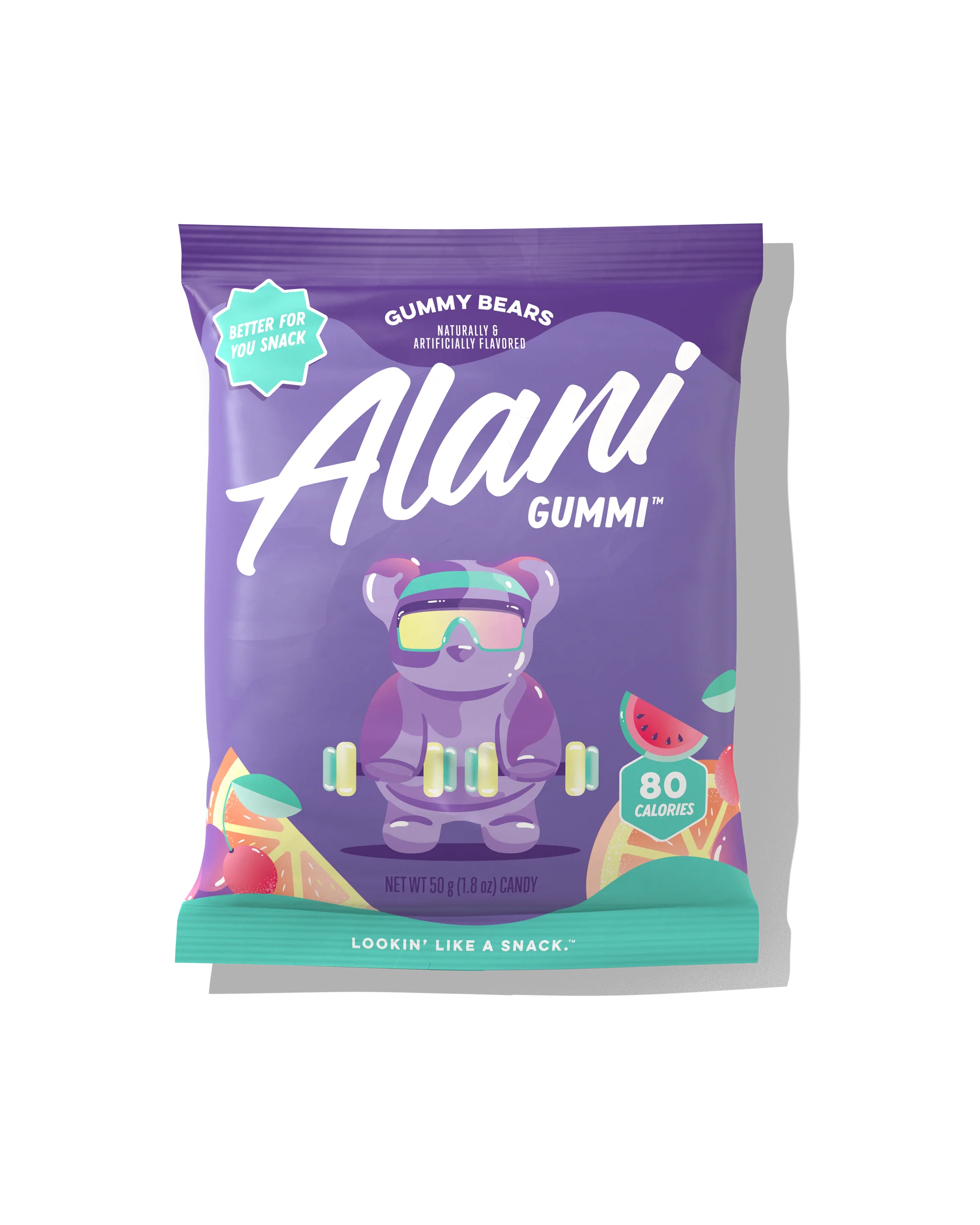 Don’t sweat the sweet stuff. With only 80 calories and 2g of sugar per bag, our gluten-free Alani Gummi Gummy Bears make smart snacking fun and flavorful! Each bag contains chewy, juicy bursts of Watermelon, Grape, and Fruit Punch – plus 7g of fiber!