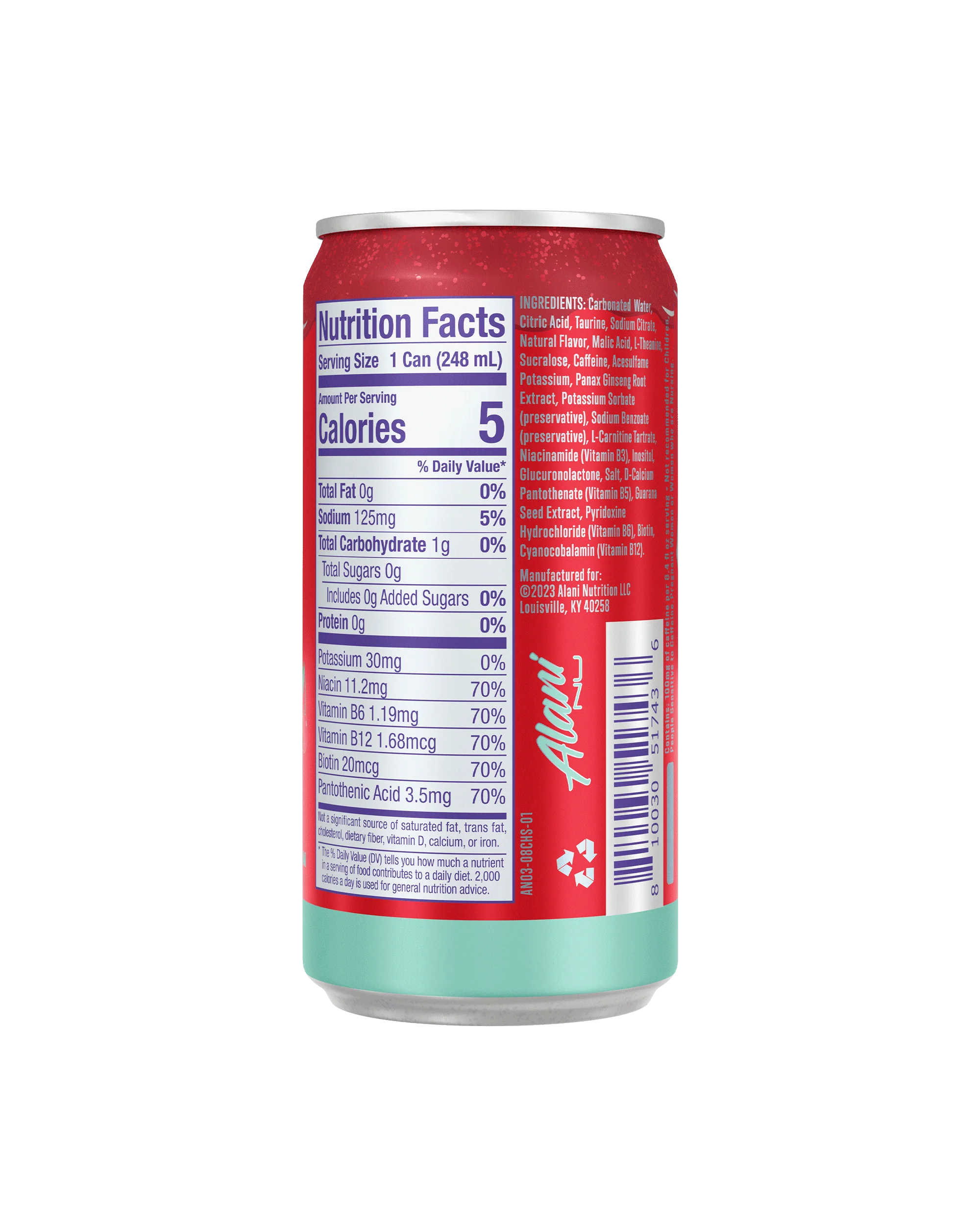 | Ingredients: Carbonated Water, Citric Acid, Taurine, Sodium Citrate, Natural Flavor, Malic Acid, L-Theanine, Sucralose, Caffeine, Acesulfame Potassium, Panax Ginseng Root Extract, Potassium Sorbate (preservative), L-Carnitine Tartrate, Niacinamide (Vitamin B3). Inositol, Glucuronolactone, Salt, D-Calcium Pantothenate (Vitamin B5), Guarana Seed Extract, Pyridoxine Hydrochloride (Vitamin B6), Guarana Seed Extract, Pyridoxine Hydrochloride (Vitamin B6), Biotin, Cyanocobalmin (Vitamin B12).
